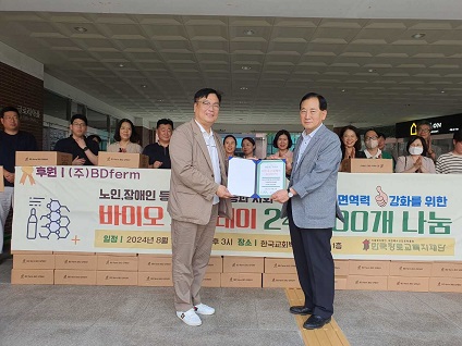 법인은 (주)비디펌으로부터 어르신과 장애인 등 건강취약계층과 일선 사회복지 종사자들의 면역력 강화에 보탬이 되는 바이오스프레이 제품을 후원받았다.