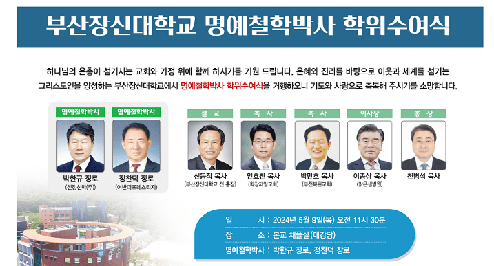 교단 총회 장로 부총회장을 역임하였고 현재 법인 이사로 재임 중인 이사 박한규 장로님이 2024년 5월 9일 부산장신대학교에서 명예철학박사 학위를 받습니다.