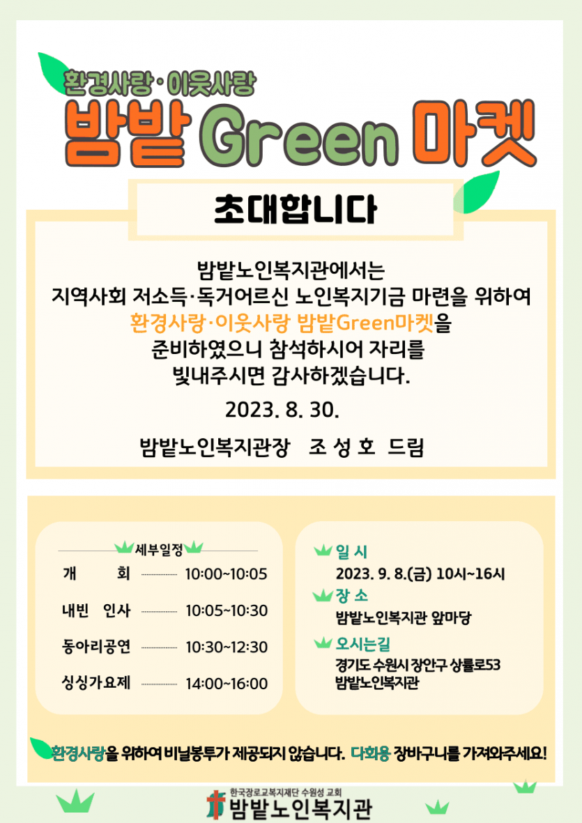 9월 8일 (금) 환경사랑.이웃사랑 밤밭Green마켓 개장 작성일2023.09.05 조회수1,058 작성자한국장로교복지재단 본문 지역사회 저소득, 독거 어르신을 위한 환경사랑.이웃사랑 밤밭Green 마켓을 2023년 9월 8일(금) 밤밭노인복지관에서 개장합니다.