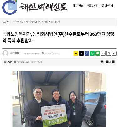 기사링크 : 백화노인복지관, 농업회사법인(주)산수골로부터 360만원 상당의 특식 후원받아 < 칭찬합니다 < 행정/기관 < 기사본문 - 태안미래 (tanews.co.kr)