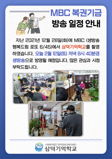 지난 2022년 2월 12일 토요일 MBC 생방송 행복드림 로또 6/45의 황금마이크가 간다 코너에서 삼덕기억학교가 소개되었습니다.