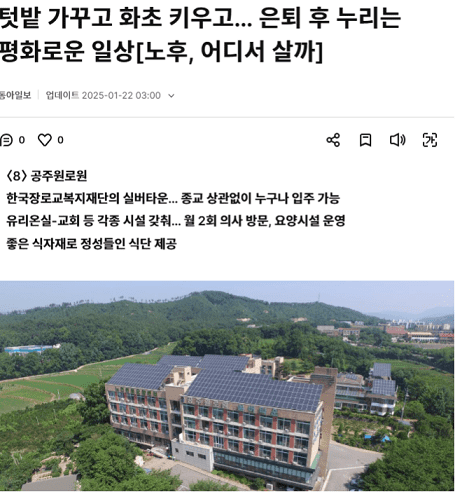 [동아일보]텃밭 가꾸고 화초 키우고… 은퇴 후 누리는 평화로운 일상[노후, 어디서 살까], 공주원로원 작성일2025.04.29 조회수550 작성자한국장로교복지재단 본문 시 설 명 : 공주원로원보도매체 : 동아일보기사링크 : 텃밭 가꾸고 화초 키우고… 은퇴 후 누리는 평화로운 일상[노후, 어디서 살까]|동아일보