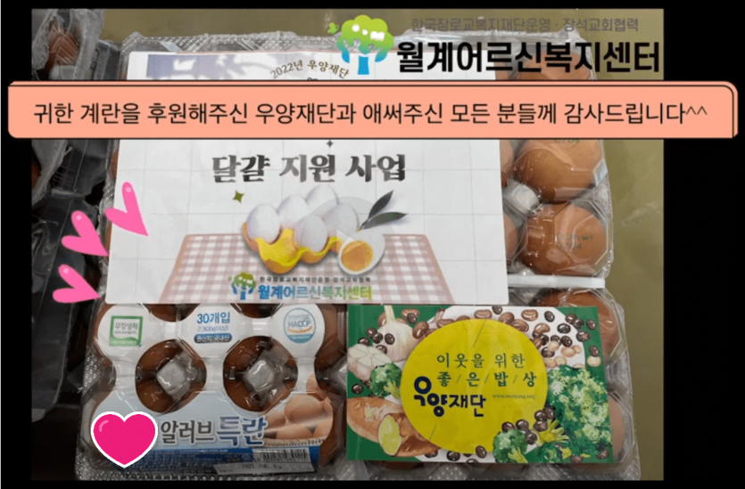 월계어르신복지센터, 달걀지원 사업 작성일2022.07.25 조회수1,684 작성자한국장로교복지재단 본문 월계문화복지센터의 월계어르신복지센터에서 우양재단의 지원으로지난 2022.7.18. 어르신들에게 신선한 먹거리 지원으로 달걀을 나눠드렸습니다.